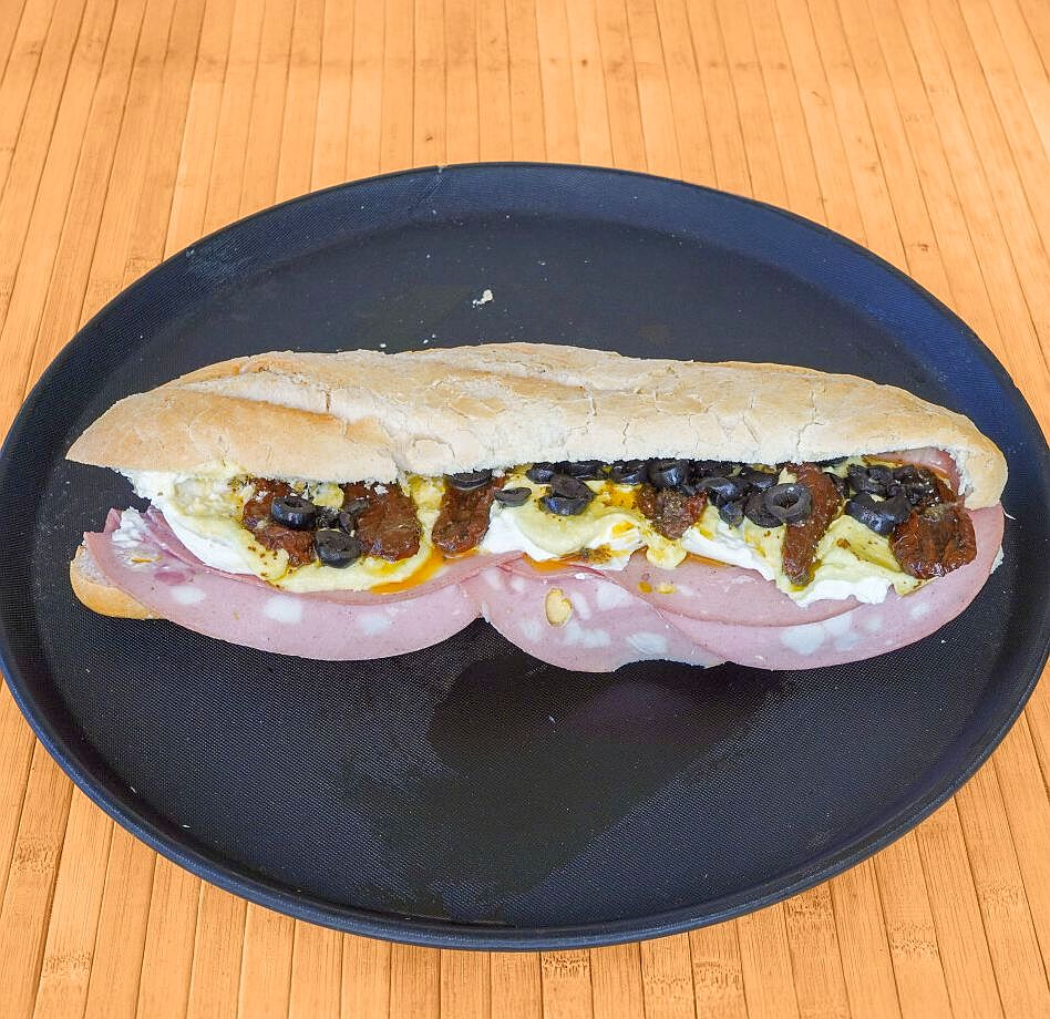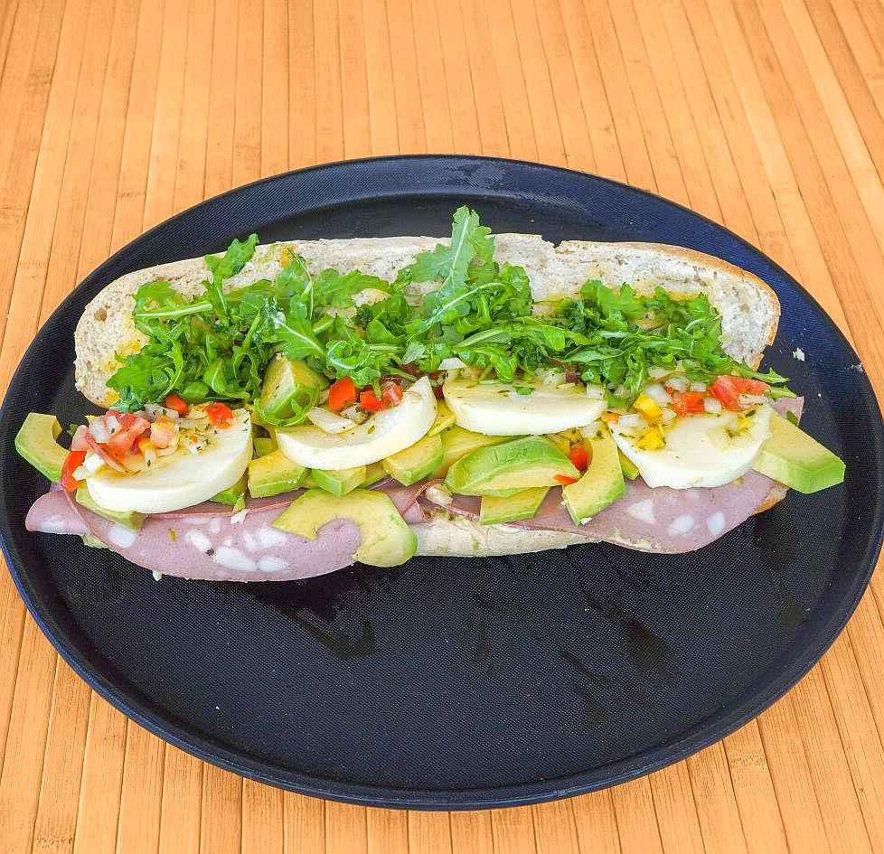 Pan 33 cm, mayonesa de aguacate casera, tomate seco en aceite de oliva, burrata fresca, fiambres a elegir (mortadela con pistachos Ferrarini, jamón cocido Ferrarini, jamón cumbre ibérica, chorizo ibérico), rúcula o canónigos, cebolla frita crujiente.